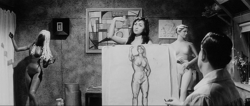 En Yaju no seishun [Youth of the Beast, 1963], toda la pantalla es un espejo mágico, literalmente. En el fondo vemos un striptease, en un espacio cerrado pero visible. La desnudista no nos ve. El espejo está ubicado muy lejos, pero parece cercano. Hay una sensación muy singular del espacio.