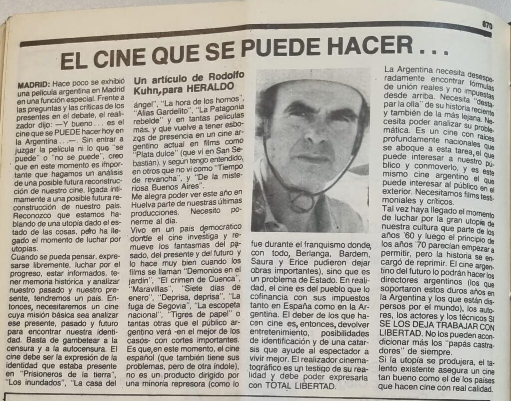 En diciembre de 1982, Rodolfo Kuhn ya llevaba más de seis años viviendo fuera de Argentina. A partir del golpe de Estado de 1976, el cineasta se había radicado primero en la República Federal de Alemania y, dos años después, en España, donde realizaría sus dos últimas películas: la ficción El señor Galíndez, basada en la obra teatral de Eduardo “Tato” Pavlovsky, y el documental Todo es ausencia, sobre la lucha de las Madres de Plaza de Mayo. En este breve artículo, escrito en plena transición democrática, Kuhn reflexiona sobre la censura estatal y el modo en que impone límites a los artistas, proponiendo una serie de preguntas relevantes en aquel contexto: ¿qué debe cambiar en el cine argentino?, ¿qué podemos recuperar del pasado de nuestra cinematografía?, ¿qué podemos aprender de la experiencia de un país que vivió décadas en dictadura, como España? A simple vista, las respuestas a estas preguntas pueden parecer obvias. Sin embargo, es posible encontrar la raíz de algunos elementos claves del cine de ficción de la posdictadura, como el recurso frecuente a la metáfora y la alegoría, en la imposibilidad de decir y mostrar propias de la censura dictatorial. Una cierta línea de investigación sugiere, de hecho, que para comprender el “cine de los 80” debemos pensarlo desde la dictadura y no, como tantas veces se hace, desde el regreso a la democracia. Dicho de otra manera: en 1983 la censura se levantó, pero ciertos modos opacos de entender la ficción persistieron durante muchos años. En este sentido, las reflexiones de Kuhn son fundamentales para pensar los logros del cine del período, pero sobre todo sus fracasos.
