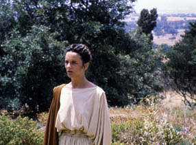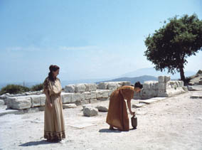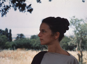 Sófocles, menciona Delia, tiene una nueva obra, y todo el mundo “se pregunta y discute cuál de las vírgenes de la ciudad es la tierna y grave heroína a la que ha llamado Antígona”. Así que Panthea hace de Antígona. Indignada por la expulsión de Empédocles a la calle (como tantos personajes de Straub-Huillet: Nicht versöhnt, “La luna”, Klassenverhältnisse [Relaciones de clase, 1984], Schwarze Sünde, Antigone, Sicilia!, Operai, Umiliati, por no mencionar Geschichtsunterricht, Moses und Aron, Trop tôt, Lothringen! [1994]), Panthea desafía el orden social y a su padre, y se impone a sí misma como sacrificio. Ella (Martina Baratta) incluso se parece a Antígona (Astrid Ofner). Y ella también atrae a una “hermana” para que se una a su desafío. En una larga toma, Panthea mira horizontes fuera del espacio del cuadro.