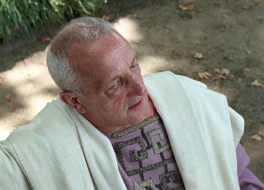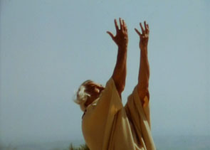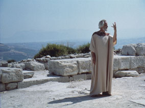 Tal justificación del suicidio desconcierta a todos, tanto en la película como fuera de ella. Su discípulo Pausanias (Vladimir Baratta) lo provoca constantemente por su manera sentenciosa. “Sigue tu propio camino”, le dice finalmente Empédocles, con todas las letras, “pero, en cuanto a mí, voy a lanzarme al volcán. ¡Ah, qué dicha!”. Al igual que Huw, al igual que el cura de Robert Bresson, Empédocles cierra los ojos, evoca una fantasía y se sacrifica por ella, desafiando a la “roca”. Quiere ser llama, como Juana de Arco, como el monte Sainte-Victoire de Cézanne. Y, al igual que el hipócrita Ransom Stoddard (James Stewart) en The Man Who Shot Liberty Valance (1962) de Ford, habla demasiado. Está posando como un rayo de sol, pero con los ojos cerrados.