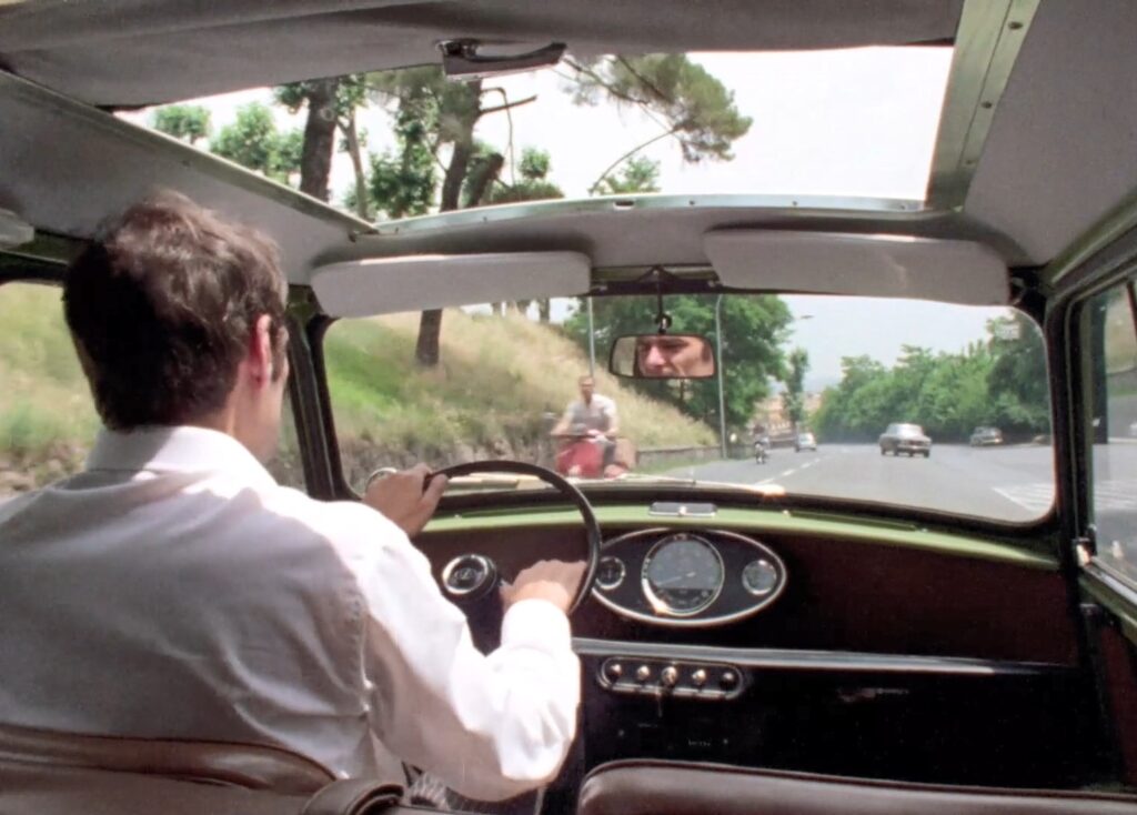 Un joven burgués de hoy en día, vestido de traje, entra en Roma al volante de un coche. Estamos detrás de él y miramos derecho al frente, prisioneros de ese habitáculo, inmovilizados, mientras la ciudad desfila a ambos lados. Es un plano largo y acaba dando una nueva consistencia a este urbanismo: partimos de una colina romana, donde las arterias son anchas y los edificios suntuosos y espaciados, para adentrarnos poco a poco en los barrios populares: estrechez, atascos, congestión, asfixia.