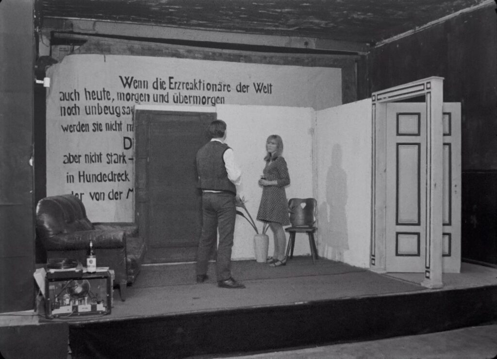 Notas: (1) Publicado originalmente en Frans van de Staak. La palabra en archipiélago, eds. Carlos Saldaña y Manuel Asín, Punto de Vista, Festival Internacional de Cine Documental de Navarra, Comisura, 2025, pp. 53-56, reproducido aquí con el debido permiso. El original es “N.a.v. Nicht versöhnt & Machorka-Muff”, CINEECRI: publikaties over film, 2, 1966. [N. de E.] (2) Partiendo de las teorías de [René] Daalder / [Samuel] Meyering sobre la integración creativa de los actores en el proceso de filmación (Vid. Skoop no. 1, Skoop no. 2, páginas 40-41). (3) Las reacciones en cierto modo paradójicas (también en la prensa) ante Machorka-Muff y Nicht versöhnt: por un lado, se habla de un nuevo realismo o una especie de cinéma vérité, pero, por otro, se señala lo “antinatural” (en realidad no lo es), especialmente en relación con los textos.
