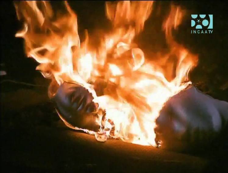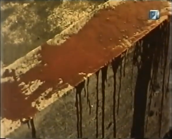 Si es fácil ver en IV E.D.E.N. eso que se suele llamar, a veces con cierta malicia, un ejercicio de estilo —sin ir más lejos, Sapir retomó varios recursos de montaje y encuadre en Picado fino—, otros dos cortos de terror de estudiantes del CERC se ubican en una zona muy distante: la de la crudeza punk. Flash sangriento, de Fabio Manes, y Soghoth, de Diego Curubeto, ambos de 1986, son films hermanos, o en todo caso primos. El dato obvio que sostiene esta idea es que Curubeto fue asistente de dirección del corto de Manes y viceversa. Pero podemos ir un poco más allá: con duraciones brevísimas, cercanas a los tres minutos, y sin diálogos, Soghoth y Flash sangriento pintan un universo oscuro y brutal, con pasión gore y sin los golpes de efecto a los que otros realizadores de terror nos acostumbrarían a partir de la década siguiente1. Soghoth es el retrato de un ritual caníbal perpetrado por un grupo de jóvenes góticos, entre cielos opacos y un paisaje desolador insólito de monolitos de cemento, que refleja desde su arquitectura la oscuridad de los personajes. Flash sangriento muestra a una mujer (Sandra Ballesteros) que en medio de una cena familiar, mientras un niño devora un higo con fruición, se retira al baño, donde tiene una hemorragia eterna que la termina matando. El plano del chico llenándose la cara con los jugos del fruto y el de la vagina sangrienta de Ballesteros vuelven a Flash sangriento una de las películas más explícitas y sexuales de la década. La aparición, al final, de varios jóvenes góticos con los rostros pintados de blanco, que observan el cadáver de la mujer con cierto placer, conectan con Soghoth, pero sobre todo con Testigos en cadena y con la posterior IV E.D.E.N.; una conexión que señala el carácter político de estos cortos posdictadura y que se podría sintetizar, vuelta de tuerca mediante, en el título del largo de Cova y Maldonado: alguien nos sigue mirando.
